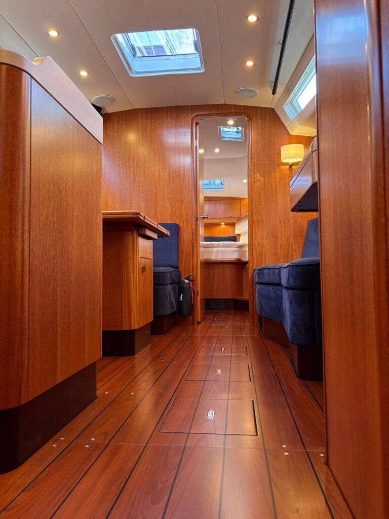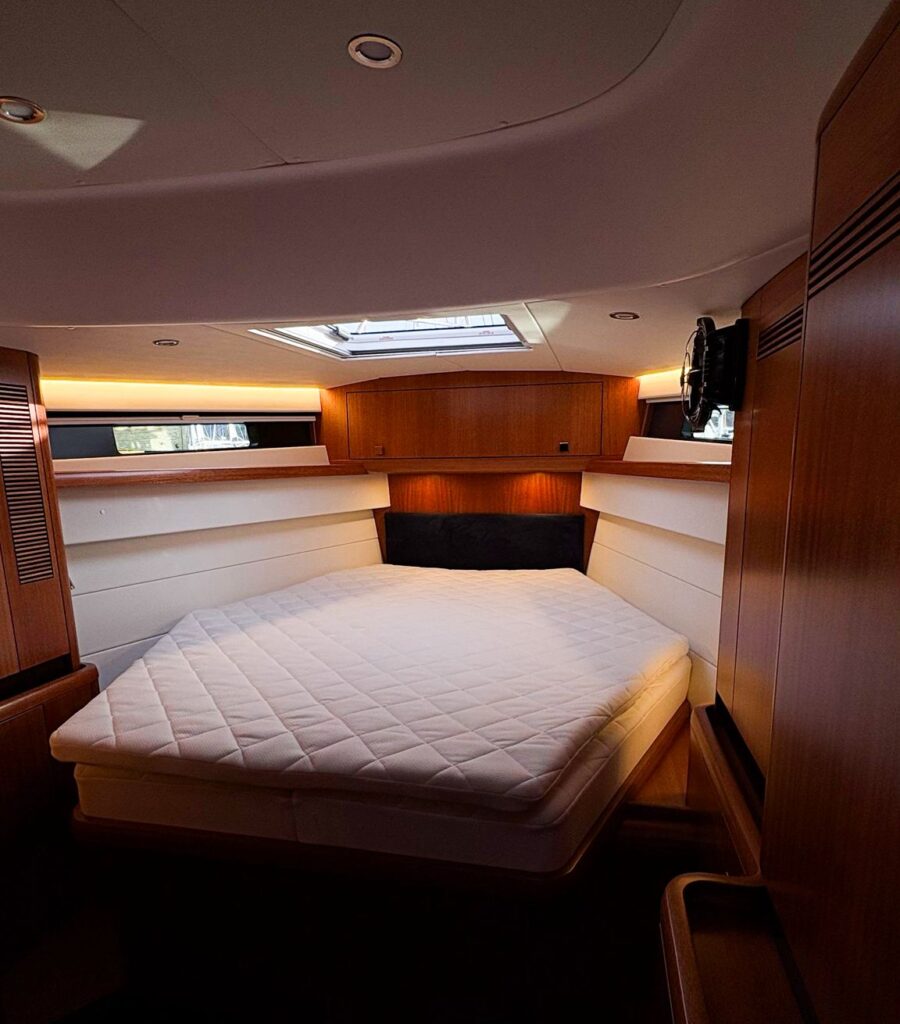 Traditionally, the 451 AC features a forward cabin with a V-berth layout. With this new option, the cabin can instead be configured with a centerline island berth, creating a more defined and spacious owner’s cabin. This layout improves accessibility from both sides of the bed and enhances overall comfort, particularly for extended cruising.
